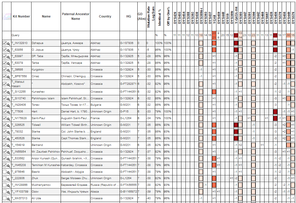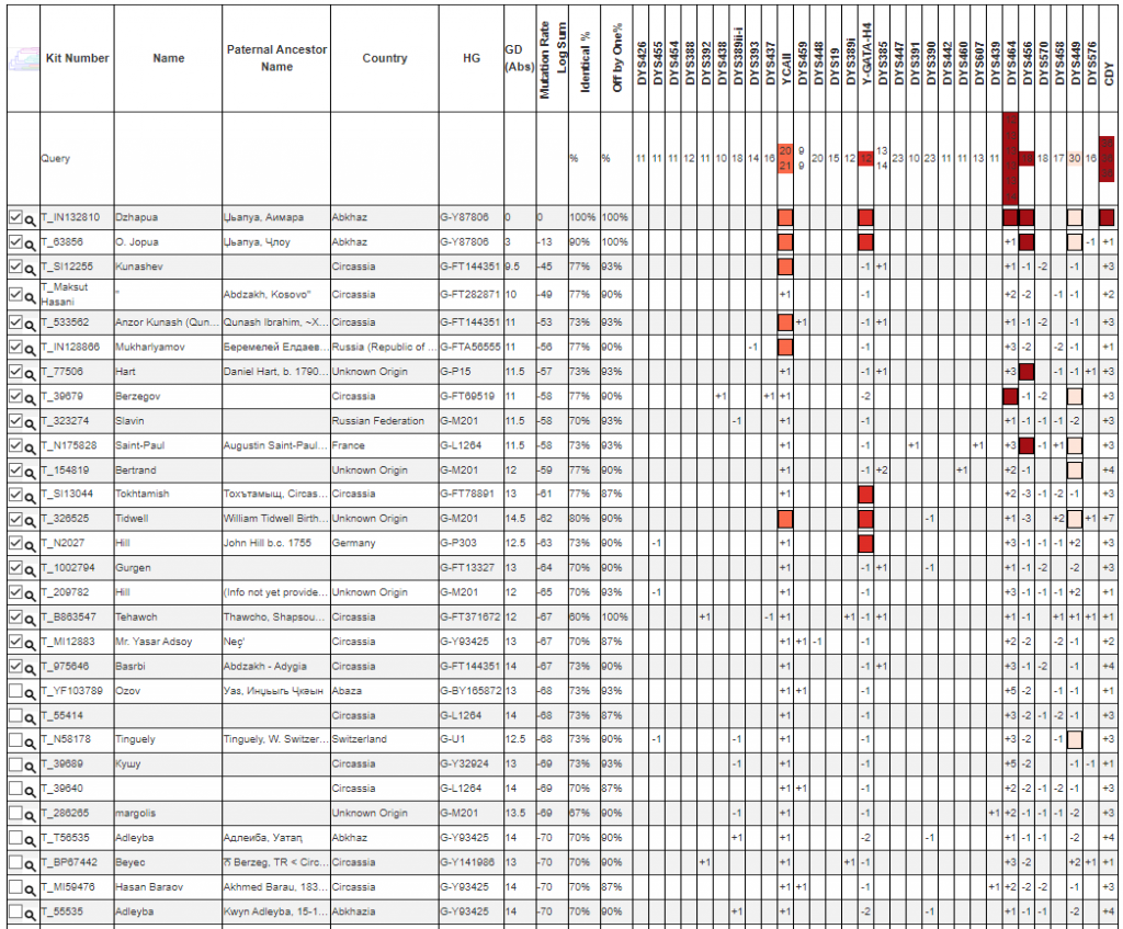 Протестированный принадлежит к патронимии (абиԥара) Матыт-иԥацәа из с. Аимара. Родословная сдавшего: Матыт > Титу > Ҳаҭхәа > Кьарантыхә > Шьаликәа > … > … > …