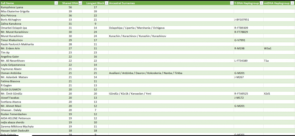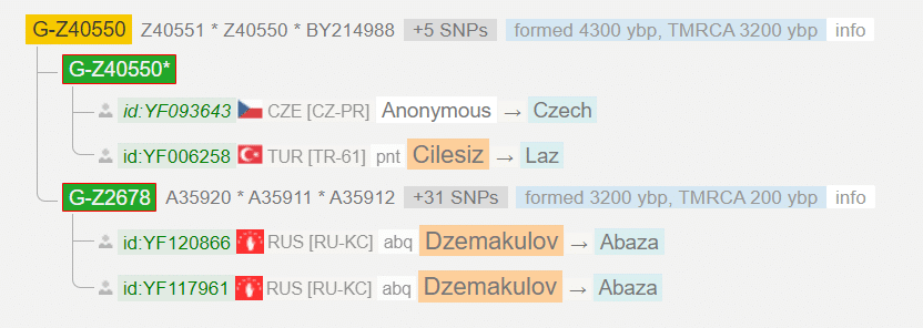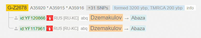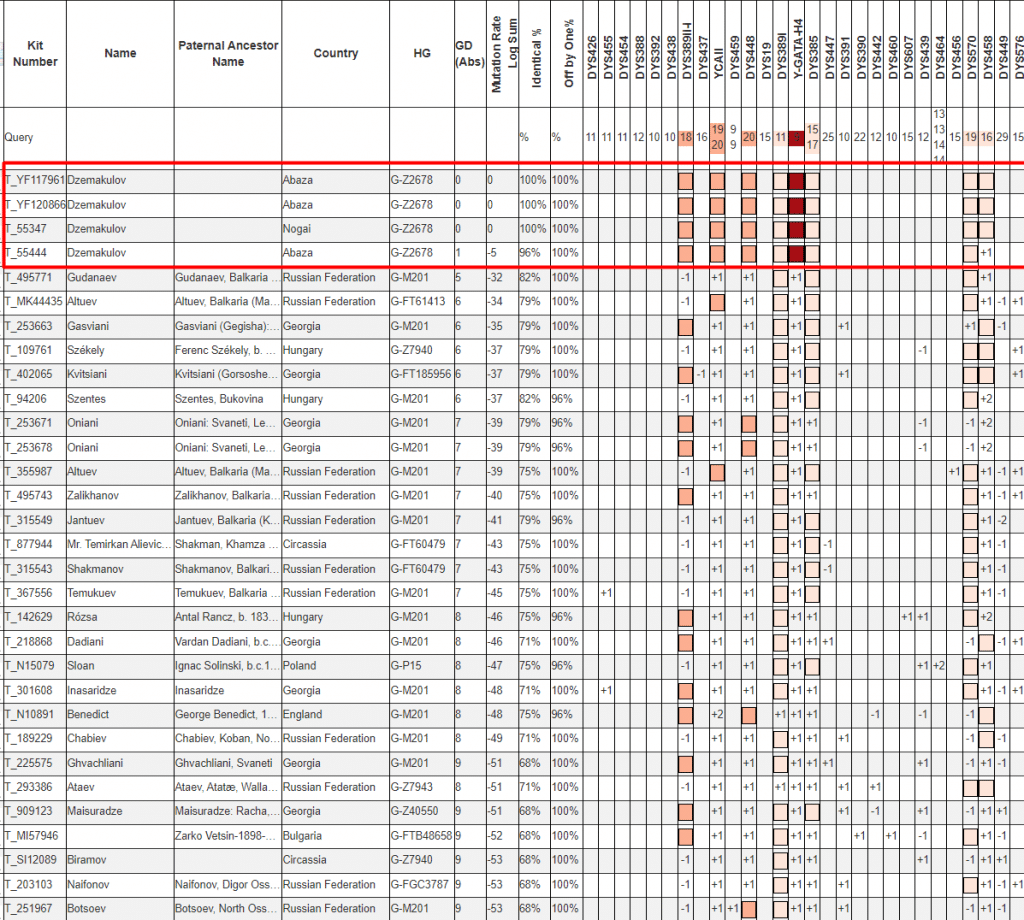 По результатам ДНК теста выявлено совпадение 4х линий Джемакуловых. 2 абазин из Красного Востока и один ногаец из а. Икон-Халк (Тохтамышевский).