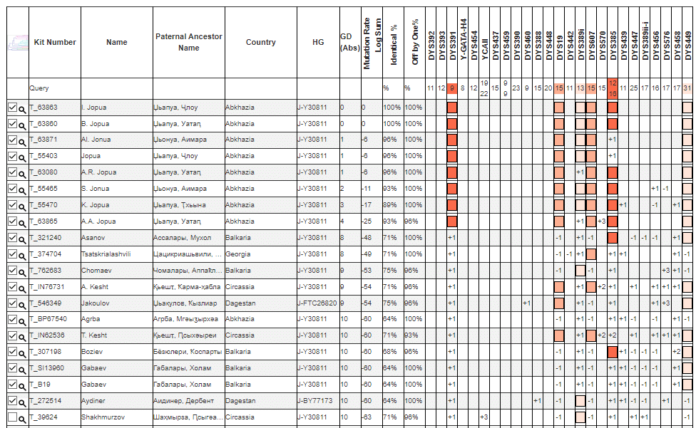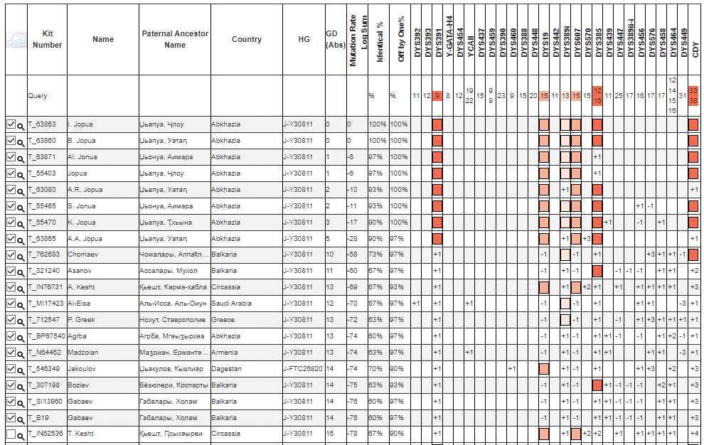Протестированный принадлежит к патронимии (абиԥара) Ӷьаџь-иԥацәа из поселка (аҳабла) Аимара. Родословная сдавшего: Ӷьаџь > Марыҟәа > Урыс > Гәаџь > Ҷыҷ > Радион > Хьрыԥс > Саид.