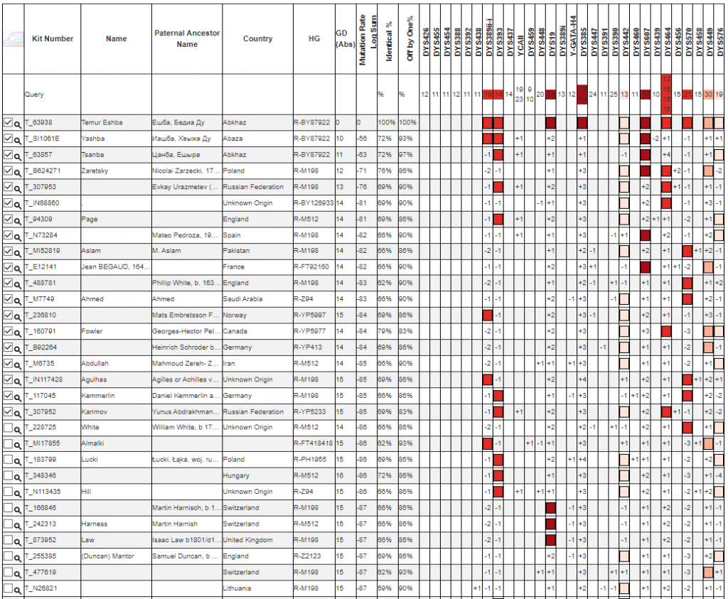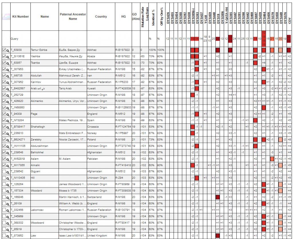 По результатам теста выявлено общее происхождение с абазинскими дворянами Иашба (Ешба) и дворянами Цанба из с. Эшера Бзыпской Абхазии, вероятными потомками некоего Цаны Эшба.