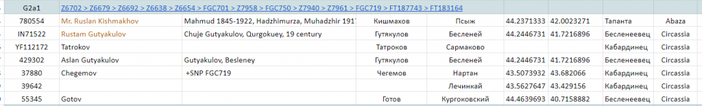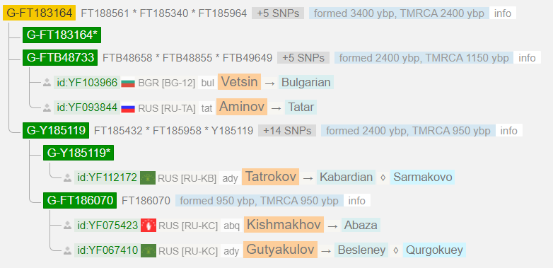 В нижней части (Y185119) на дистанции ~ 950 кабардинец Татроков и чуть более близкие между собой абазин Кишмахов и бесленеевец Гутякулов. До болгарин и татарина адыго-абазинская ветка на дистанции ~ 2400 лет.