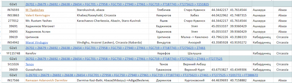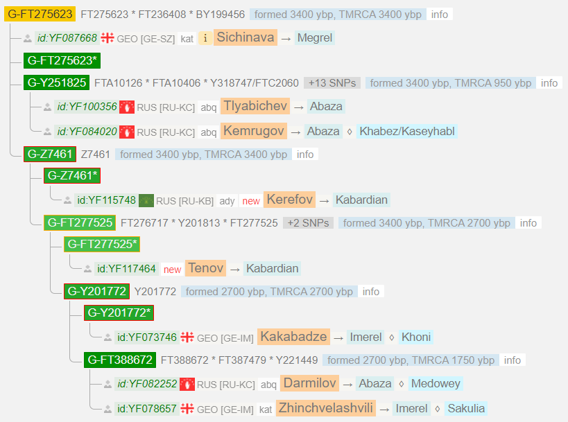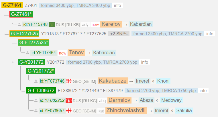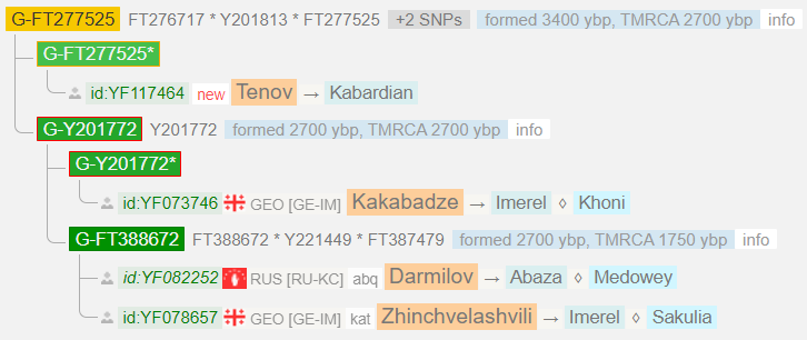Ниже расположен кабардинец Тенов. Его результат на уровне ~ 2700 лет к остальным кто расположен ниже. Имеретинец Какабадзе (Y201772) и расположенные еще ниже (FT388672) абазин ашхарец Дармилов.