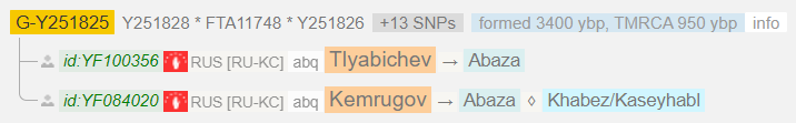 Y251825 (3) состоит из абазин Кемрюгова и Тлябичева. Возраст их ветки составляет 950 лет, что вероятно не соответствует действительности, т. к. у этих родов сохранились предания о едином происхождении и соответственно этот возраст будет значительно ниже. Сюда же, судя по всему, попадут абазины Яшевы и Хаджимовыми, у которых поверхностные тесты. Все они абазины ашхарцы.