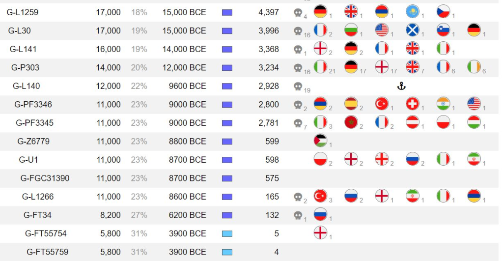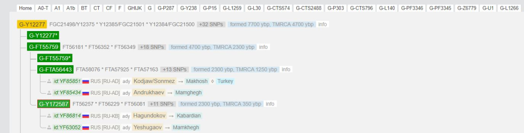Если в отношении G-L1266 мы не можем строго с одной народностью связать происхождение, то одна из дочерних веток L1266, а именно G-Y12277 (на FTDNA называется G-FT34) определенно связана с предками Адыго-Абхазов.