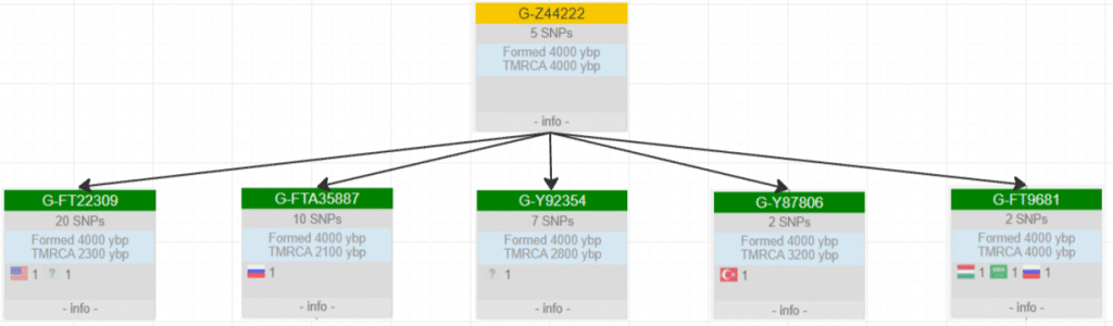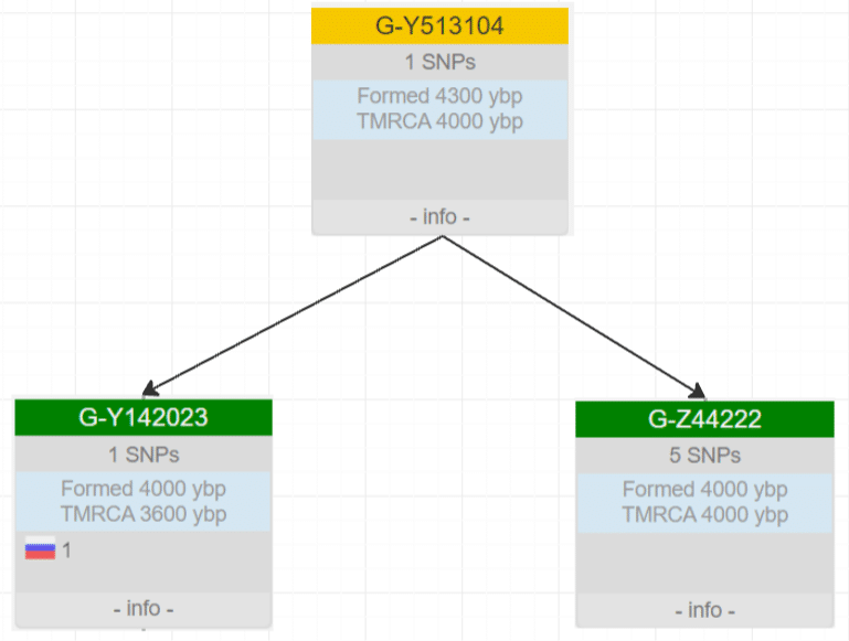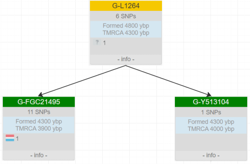 На первом этапе выделились 2 потомственные линии — FGC21495 и более массовая Y513104. Эти ветки отделились около 4х тысяч лет назад.