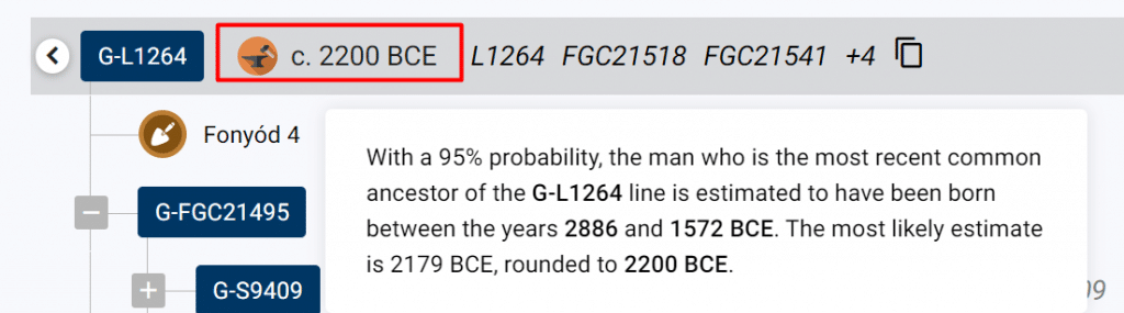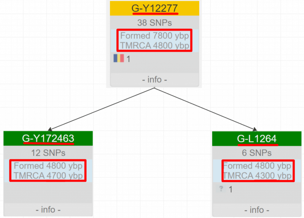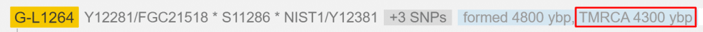 Сайт Yfull определяет цистанциию до первопредка всех кто относится к G2a2 L1264 в 4,3 тыс. лет. Другое древо, FTDNA дает похожую цифру.