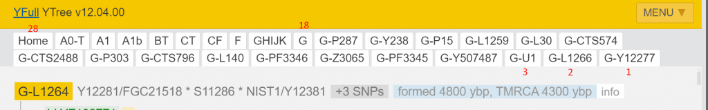 Adam > A0-T > A1 > A1b > BT > CT > CF > F > GHIJK > G > P287 > Y238 > P15 > L1259 > L30 > CTS574 > CTS2488 > P303 > CTS796 > L140 > PF3346 > PF3345 > Z6779 > U1 > L1266 > Y12277 > L1264