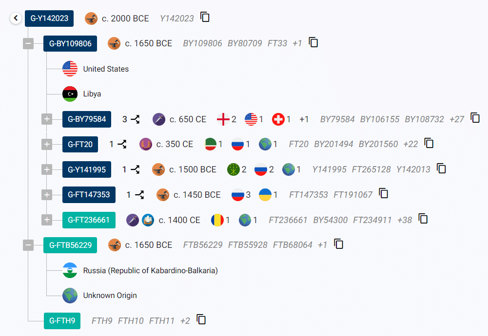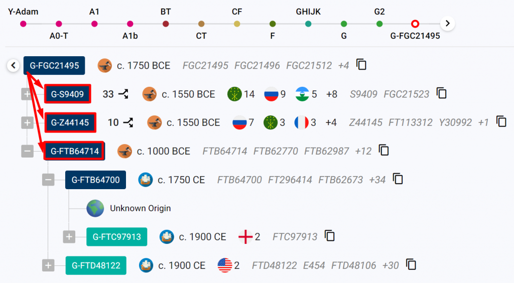 FGC21495 впоследствии делится еще на несколько уровней, которые затем еще более расширяются. На скриншоте видно, что у S9409 33 внутренних ветки. А у Z44145 всего 10. Ещё ниже субклад G-FTB64714. Это одна из немногих древних линий которых пока нет у представителей нашего проекта.