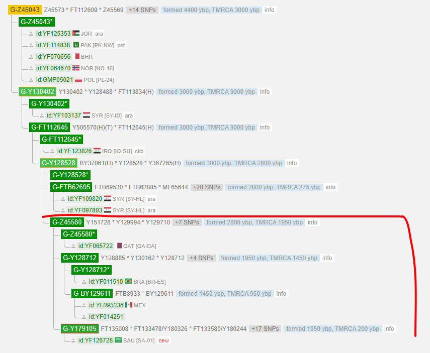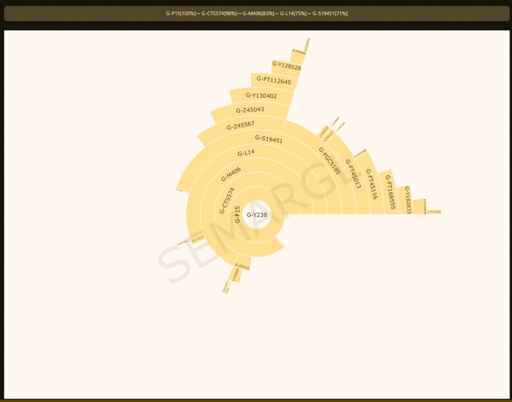 Adam > A0-T > A1 > A1b > BT > CT > CF > F > GHIJK > G > G-P287 > G-Y238 > G-P15 > G-L1259 > G-L30 > G-CTS574 > G-M406 > G-M3317 > G-FGC5089 > G-FGC5081 > G-Y2724 > G-L14 > G-S19451 > G-Z45567 > G-Z45043 > G-Y130402 > G-FT112645 > G-Y128528