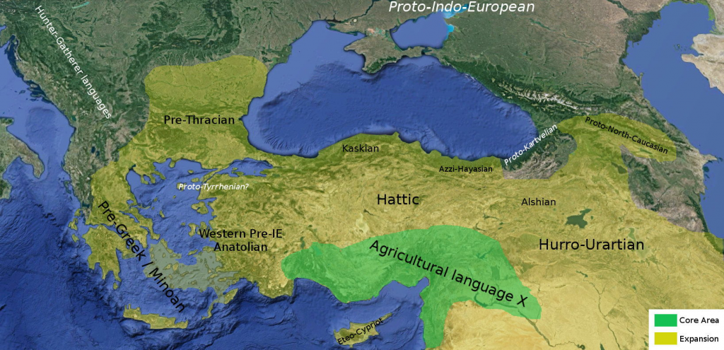 Pre-Indo-European languages of Anatolia descended from G2a2 (yellow colour).