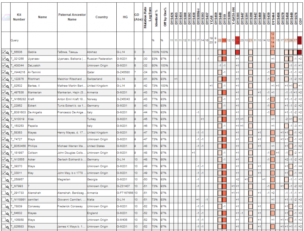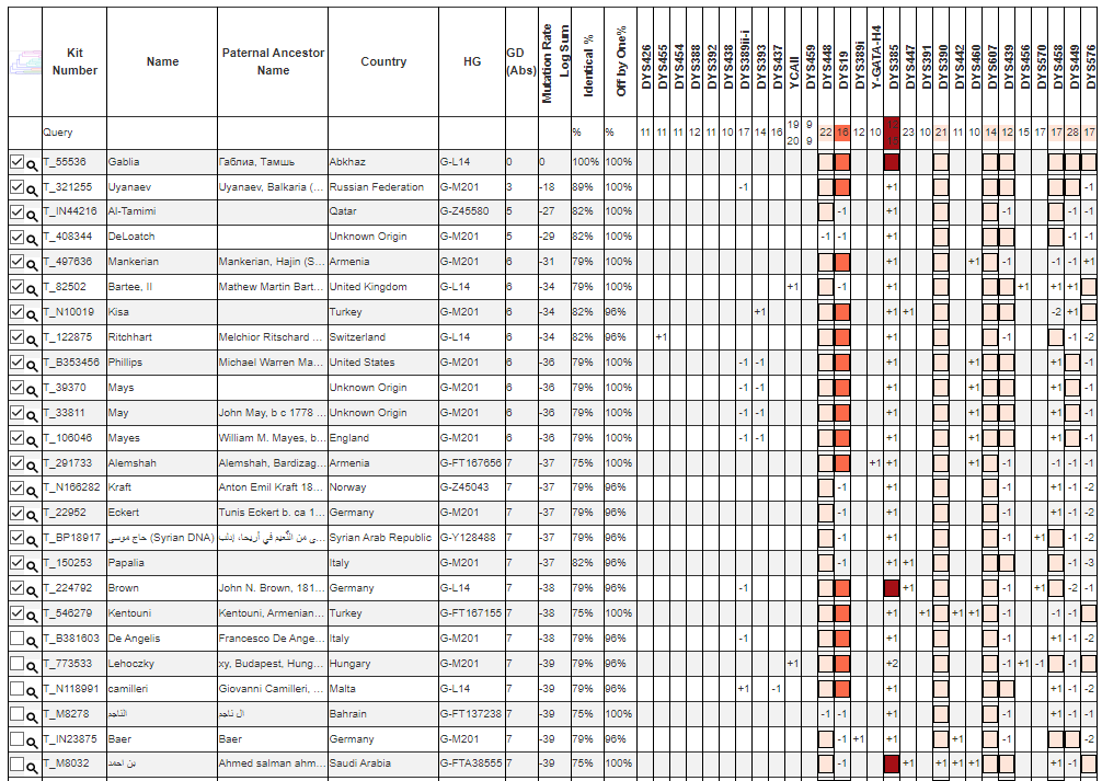 The ancestor of the tested person was evicted to Turkey in 1864 from the village of Guma and belonged to the Gablia T’ıqw-ipaçwa. At the end of the XIX century, he was able to return to his homeland and settled in the village of Tamysh, where his kin Gablia T’ıqw-ipaçwa lived (Gablia living in the village of Otkhara in Bzyp Abkhazia call themselves Çk’wal-ipaçwa). Tamysh Gablia T’ıqw-ipaçwa belong to the class of aşnaqwma (lower nobility), occupying an intermediate position between noble aamsta and peasant anxaüı, but gravitating towards the latter, so marriages between aşnaqwma and anxaüı were a common practice. Descendants of Guma village live in Turkey in Derdin village (abk. Gaima), Vyacheslav Chirikba stated that this village had 20 households of Gablia (T’ıqw-ipaçwa) in 2014.