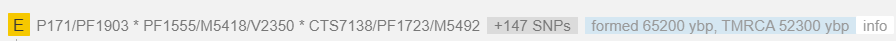 Линии находящиеся слева являются родительскими к расположенным правее. У каждой линии определен примерный возраст последнего общего предка. Например, таковой для всех, кто относится к гаплогруппе E, является цифра +- 52 тыс. лет. Чтобы посмотреть этот возраст для каждой из них достаточно нажать на ссылку и посмотреть значение TMRCA. Пример для E: