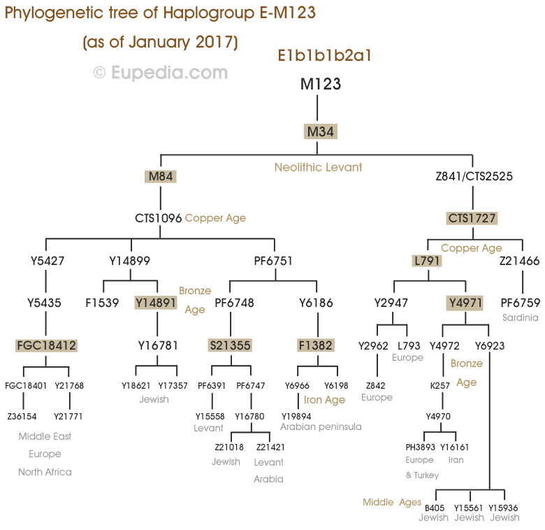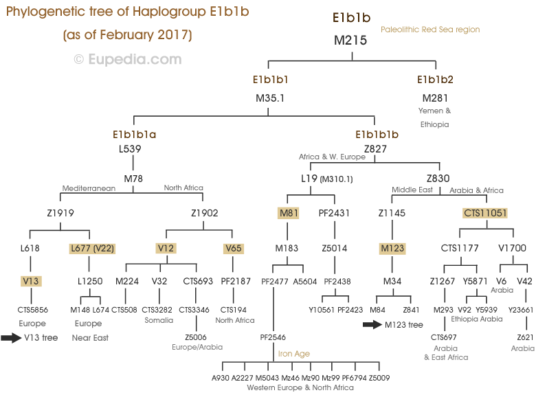 В настоящее время наибольшее генетическое разнообразие гаплогруппы E1b1b наблюдается в Северо-Восточной Африке, особенно в Эфиопии и Сомали, которые также имеют монополию на более старые и редкие ветви, такие как M281, V6 или V92. Это говорит о том, что E1b1b действительно мог появиться в Восточной Африке, а затем распространиться на север до Леванта. Тем не менее, многие линии, обнаруженные в настоящее время среди эфиопов и сомалийцев, по-видимому, произошли из Плодородного полумесяца в период неолита. Сюда входят некоторые субклады E1b1b, такие как V22 (12 000 лет) и V32 (10 000 лет), а также, несомненно, ближневосточные линии, такие как T1a-CTS2214 и J1-L136.