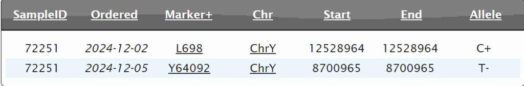 Y-хромосомные линии представляют собой последовательность генетических маркеров, которые передаются от отца к сыну. Каждый маркер (например, P287, L1259, CTS574) — это определенное изменение в ДНК, которое впервые появилось у одного из предков по прямой отцовской линии и затем передавалось следующим поколениям.