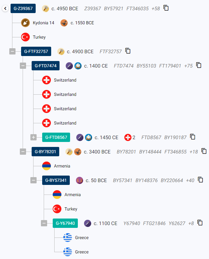 Еще один ДДНК относящийся к этой ветке — XAN016 образец найденный на острове Крит микенского периода (1200-1300 лет д.н.э.).