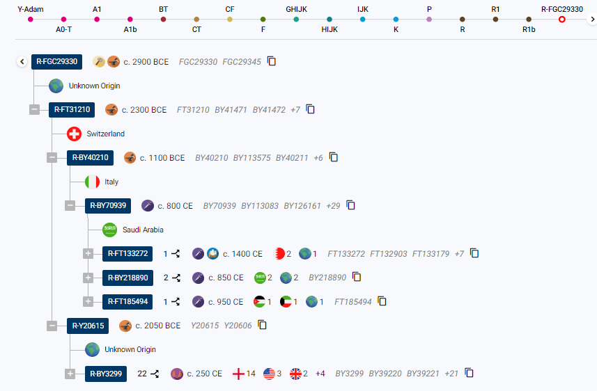 Adam > A0-T > A1 > A1b > BT > CT > CF > F > GHIJK > HIJK > IJK > K > K2 > K2b > P > P-V1651 > P-M1254 > P-P337 > P-P284 > P-P226 > R > Y482 > R1 > R1b > L754 > L389 > P297 > M269 > L23 > Z2103 > M12149 > Y467276 > Z2106 > Z2108 > Z2110 > CTS7556 > FGC29296 > FGC29330