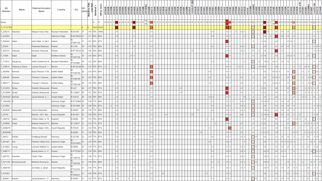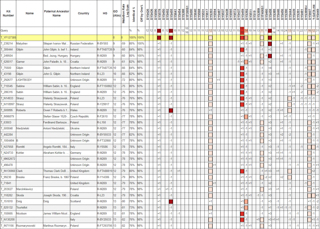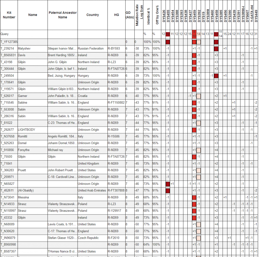 Гаплогруппа R1b самая распространенная в Западной Европе. Выявленная по результатам теста линия гаплогруппы R1b относится к относительно редким. Близких совпадений с теми, у кого есть глубокие тесты, пока не выявлено. Сравнения по маркерам с менее глубокими тестами также не обнаружило потенциально близких совпадений.
