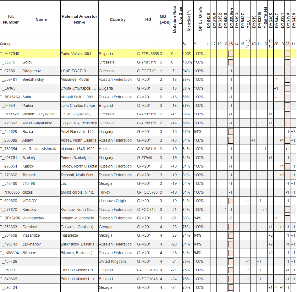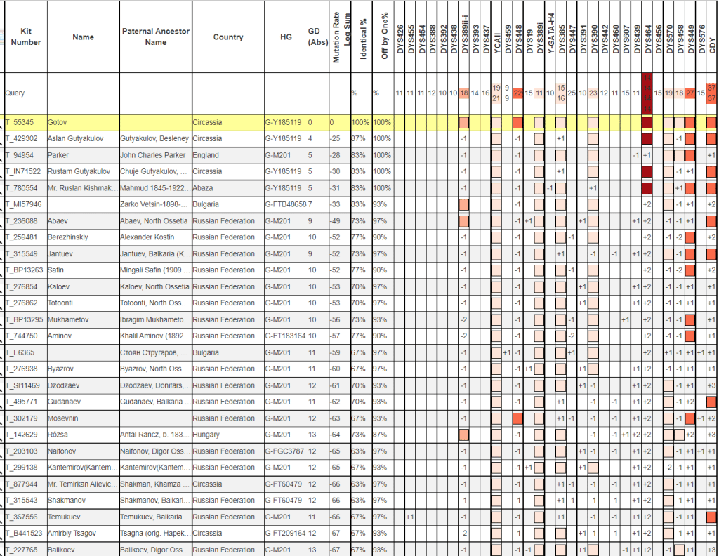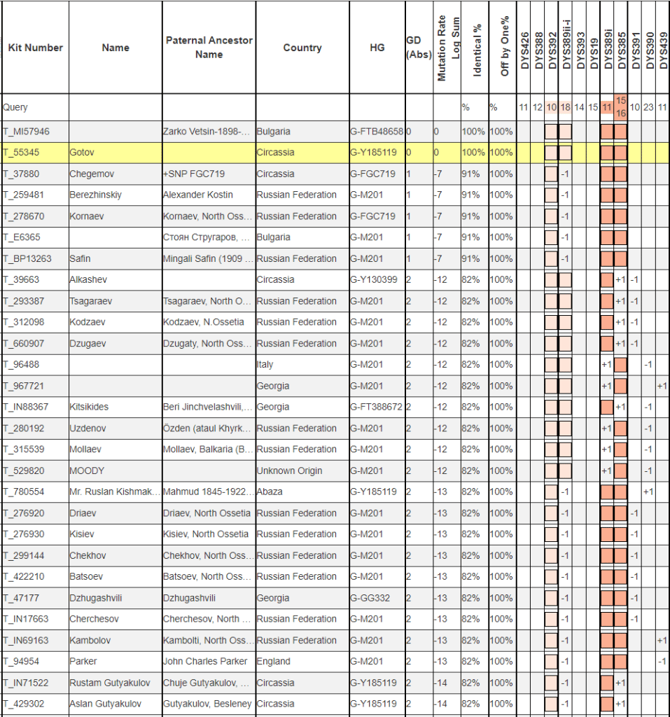 Генетическая дистанция Готова с ближайшими с Гутякуловым, Паркером и Кишмаховым составляет 4-5 шагов. Такая дистанция иногда может впоследствии (при углублении теста) показать родство на уровне превышающим 1000 лет. В данном случае, скорее всего, будет по другому. Самые быстрые маркеры (те которые находятся в последних столбцах) мало отличаются у Готова с ближайшими совпаденцами, что скорее всего говорит о возможном близком родстве.