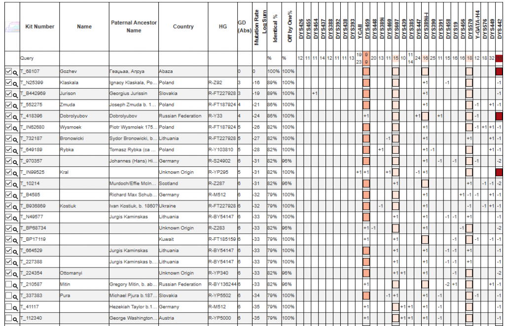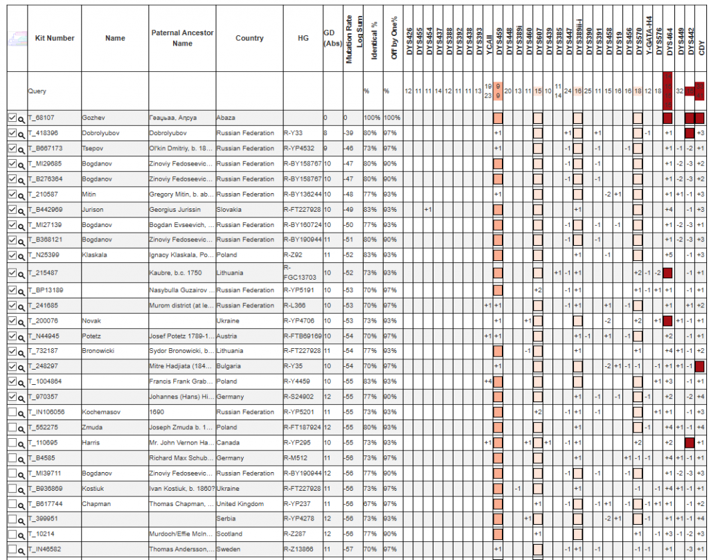 Не совпал с ранее протестированным Гожевым из того же аула, у которого результат G-L1264, что было ожидаемо, так как не имели общей родословной. В целом же тестирование ашхарских обществ обнаруживает картину гетерогенности большого количества на данный момент протестированных фамилий