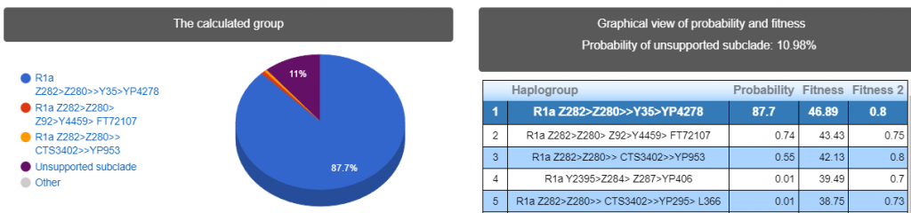 Выявлена гаплогруппа R1a >> Z280. Наиболее вероятный субклад >> R-Y84739