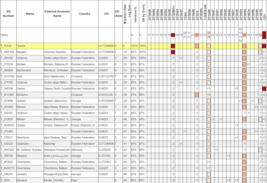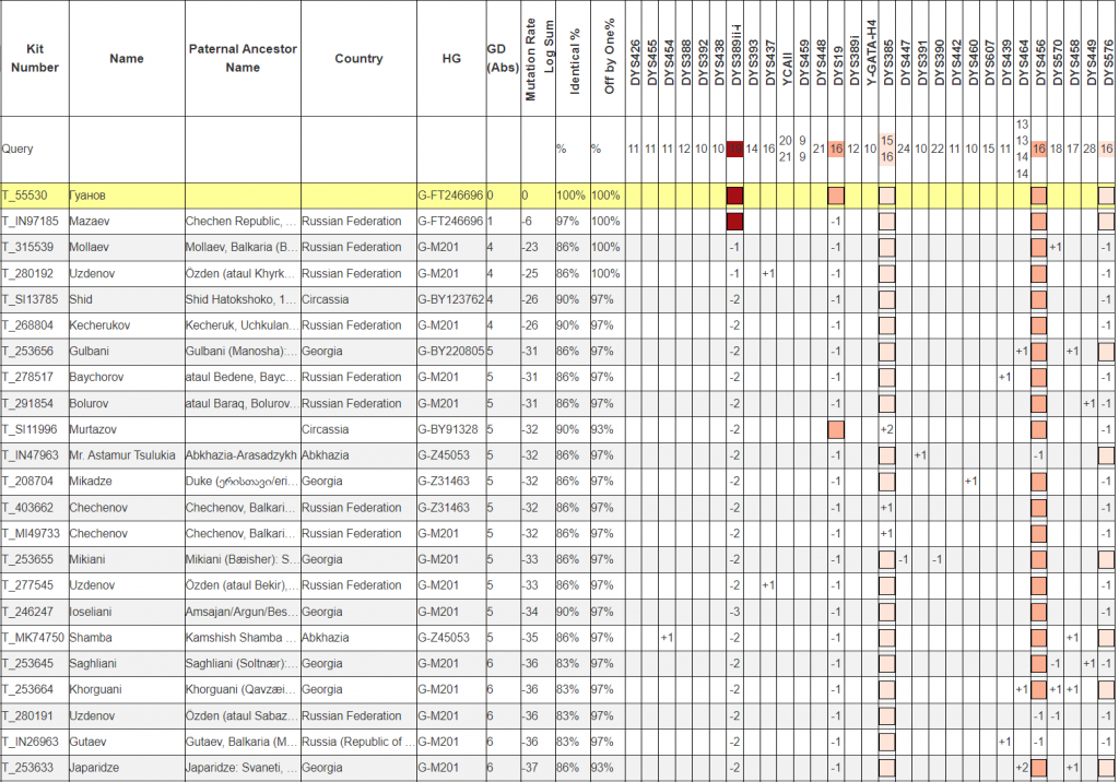 Самое близкое совпадение у Гуанов с чеченцем Мазаевым из тейпа Чергизи. Род Мазаева происходит из Кабарды. Дистанция между ними от 300 до 1000 лет, чтобы определить более точные цифры требуется углубление теста Гуанова.