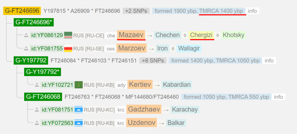 FT246696 объединяет рода объединённые общим предком жившим ~ 1400 лет назад. Вероятнее всего наиболее близкое родство будет с чеченцем из тейпа чергизи Мазаевым. По преданиями они выходцы с Кабарды. В результате междоусобной борьбы их предкам пришлось покинуть Кабарду. Вероятная фамилия Шогенов.