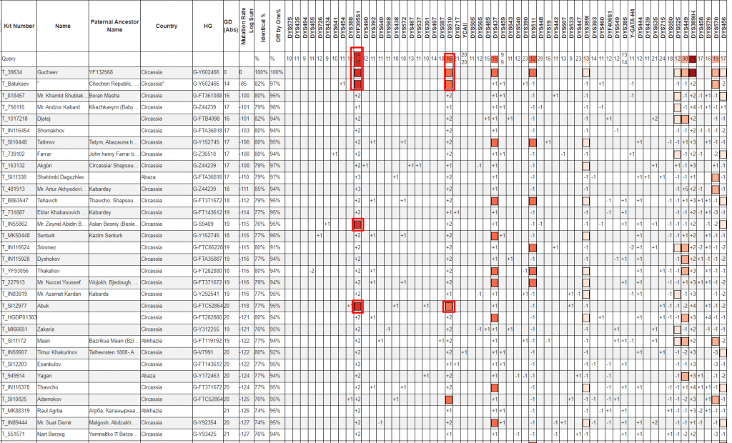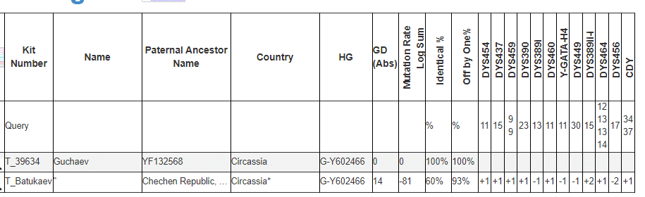 При этом определение более глубокой линии и более близких совпадений оказалось невозможным. После углубления теста наконец определена точная линия. Наиболее близкое совпадение выявлено с чеченцем черкесского происхождения (чергизи) Батукаевым.