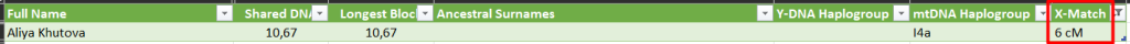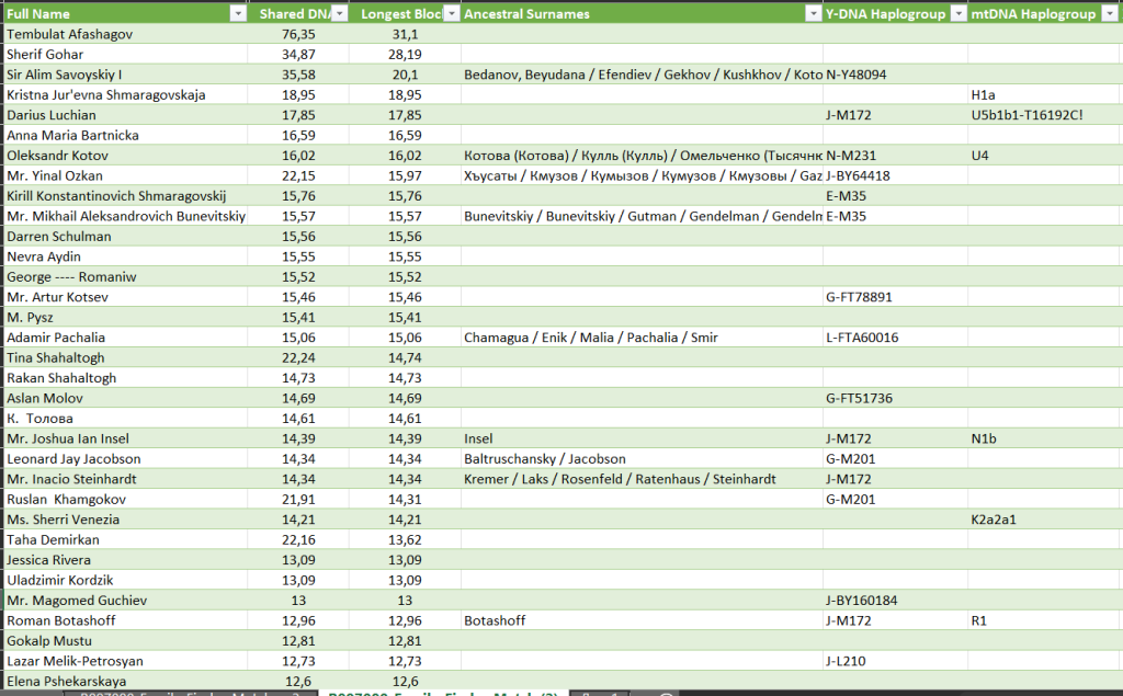 Ближайший совпадение с Афашаговым. Их родство было известно и без теста. Остальные на большой дистанции. Выявлено одно (далекое) совпадение по X хромосоме (по матери).