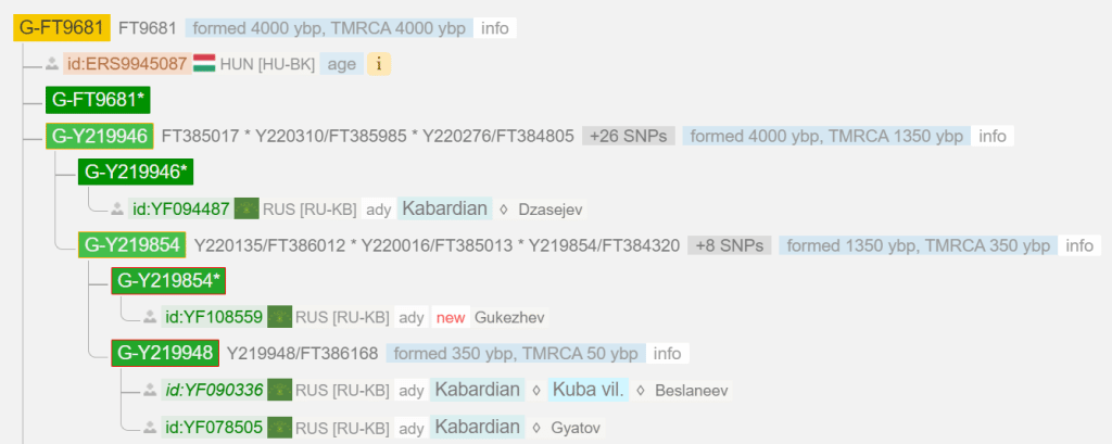 Ветка Y219946, куда попадает Гукежев, образовалась ~1350 лет назад. Как уже выше отмечено, линия состоит из 5 кабардинских фамилий: