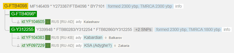 FTB4098 состоит из Калашаова (Джерокай), Балкаров (Нартан) и черкес из Саудовской Аравии Закария. Возраст ветки 2300 лет. Анализ списка совпадений по Y-STR маркерам указаных выше фамилий дает основание полагать, что эта линия возможно будет в будущем одной из самых массовых.
