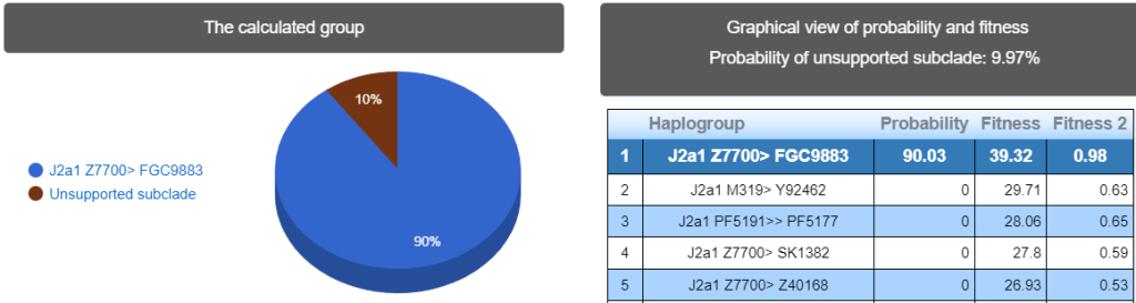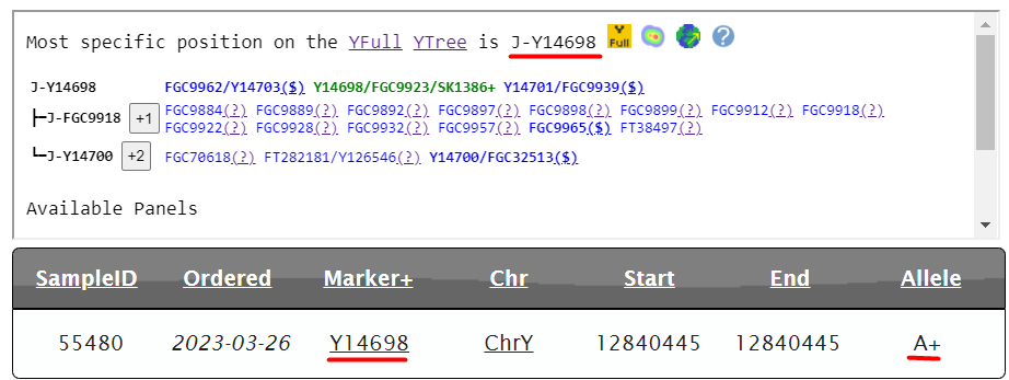 Исследовано 37 маркеров в лаборатории YSEQ. Выявлена гаплогруппа J2a. Подтвержден субклад Y14698.