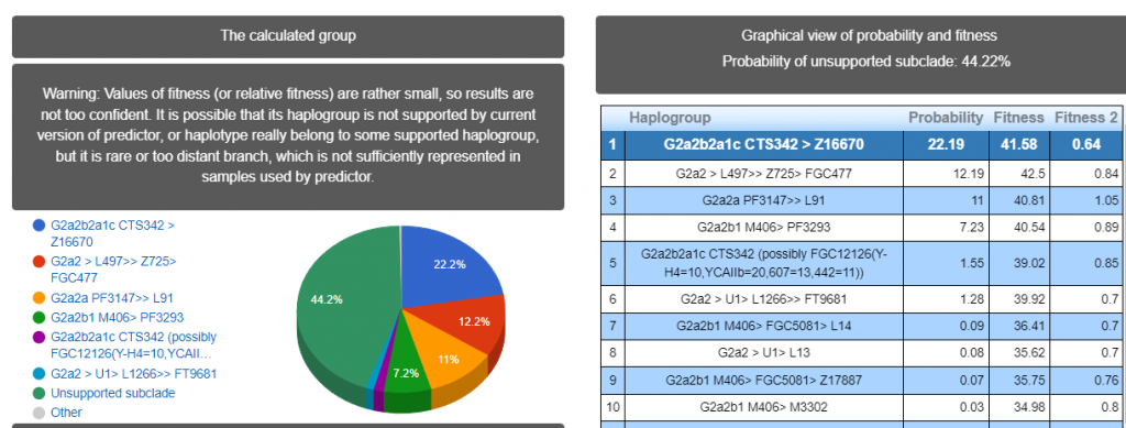 Выявлена гаплогруппа G2a2. Наиболее вероятный субклад G-L1264 >> Z44222 >> Y86896 >> Y331677