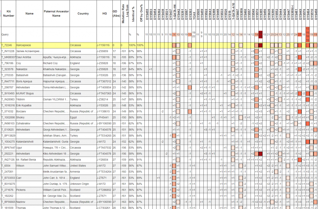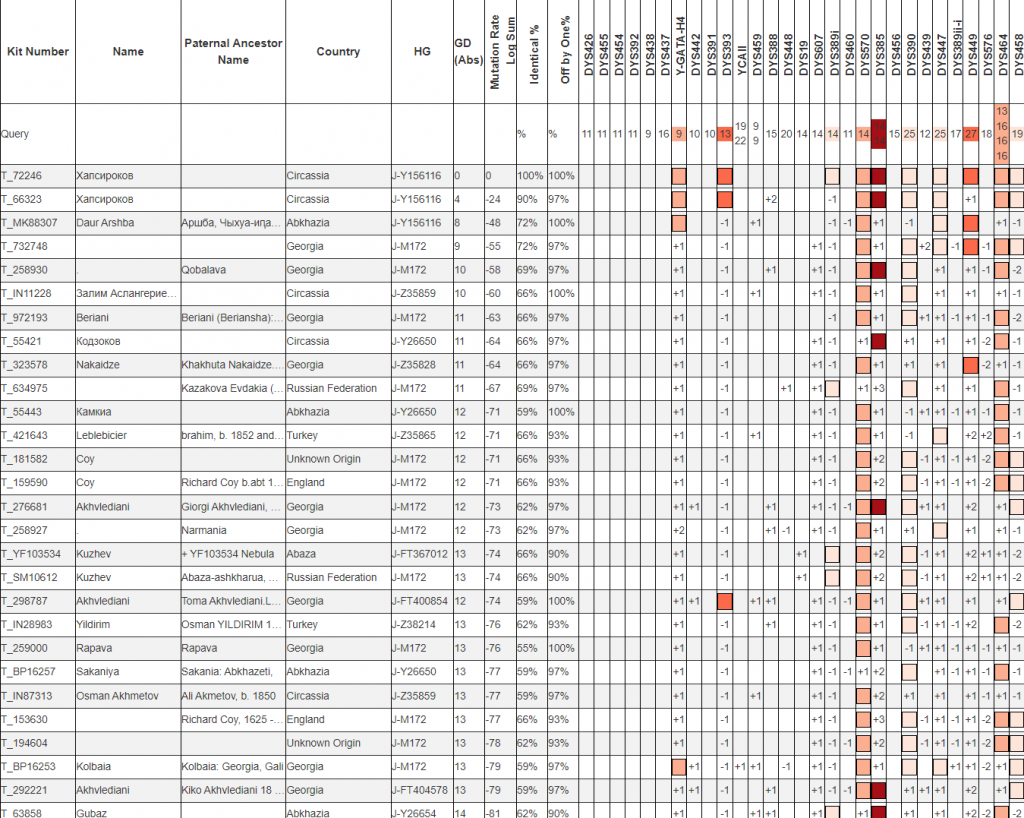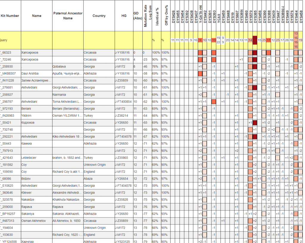 Выявленный результат один из самых частых у абхазо-адыгов. Наиболее близкое родство вероятнее всего с абзхазом Аршба. Оценить дистанцию между этими родами можно будет при углублению теста Хапсироковых.