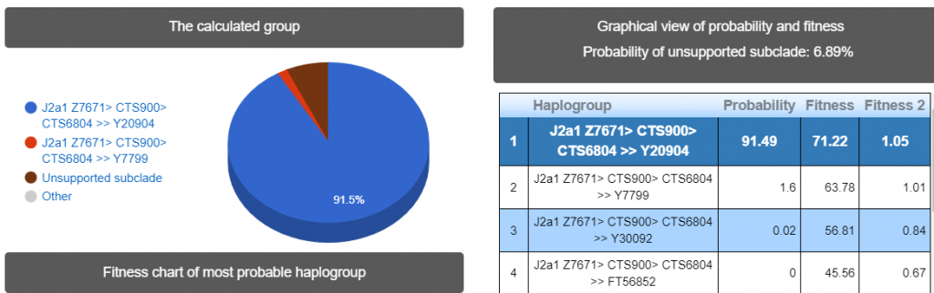 Выявлена гаплогруппа J2. Наиболее вероятные субклады M67 >> CTS900 >> Y20904