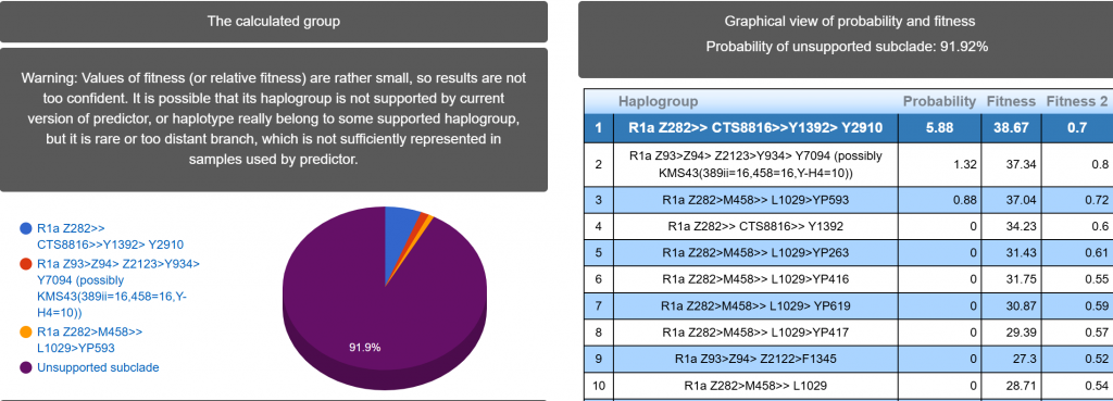 Потенциально близких совпадений не выявлено. В списке совпадений (все относительно далекие) представители совсем разных веток. Исходя из предсказаний калькуляторов наиболее вероятная линия Z280 >> Y2910.