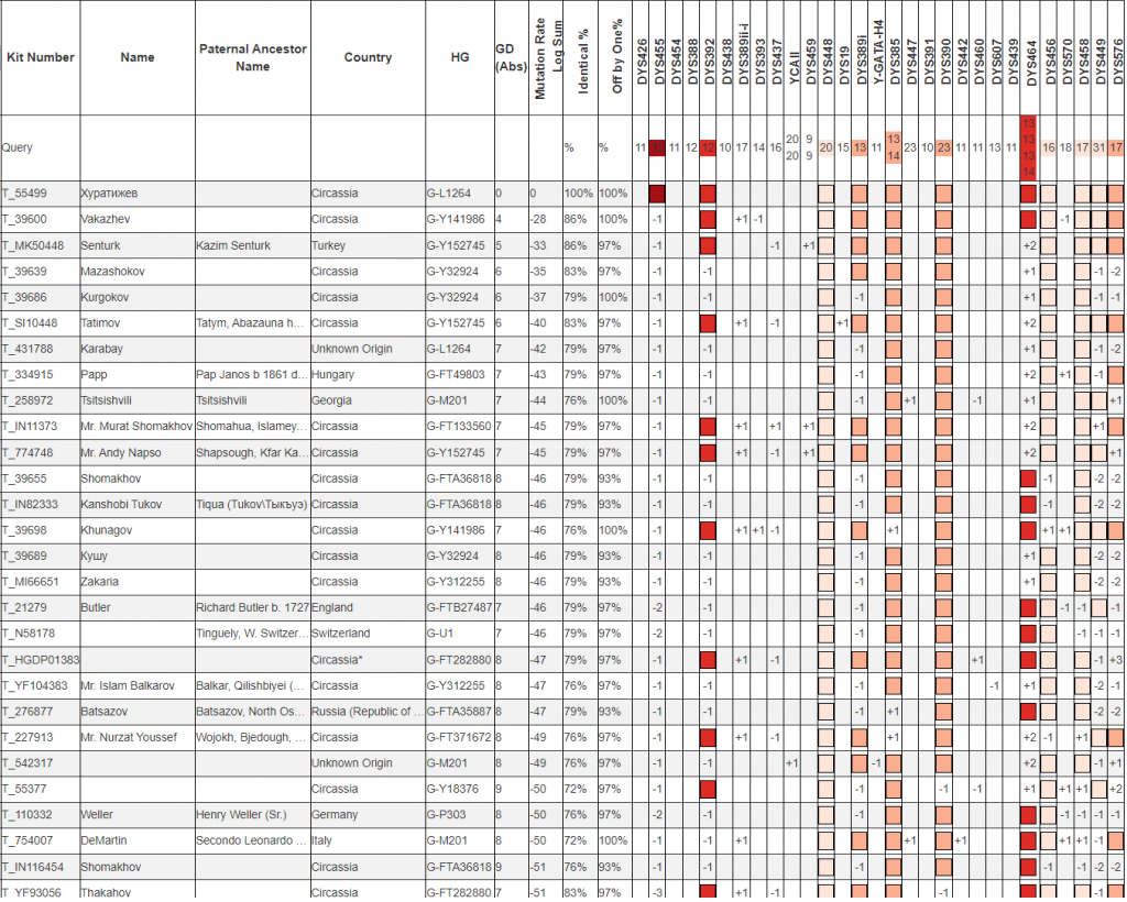 Предварительно Хуратижев попадает в ветвь G-Y141986 возрастом примерно 2900 лет, представленную на сегодня бжедугами, абадзехами, шапсугами, кабардинцами, убыхами. В этой же ветви находится результат Big-Y Шомахова из с. Исламей.