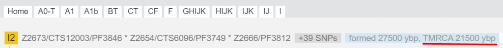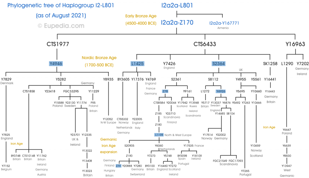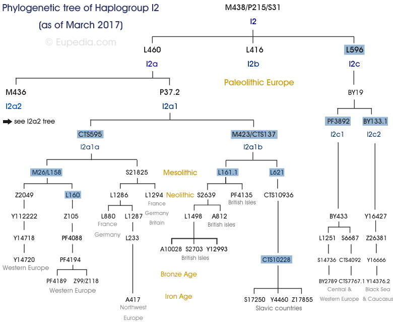 I2a2 (S33/M436/P214, P216/S30, P217/S23, P218/S32, L35/S150, L37/S153, L181) был известен как I1c до 2005 года и I2b до 2010 года. Он связан с докельто- Германские народы Северо-Западной Европы, такие как строители мегалитов (5000-1200 гг. до н. э.). Его возраст оценивается от 21 000 до 13 000 лет, что соответствует периоду эпипалеолита.
