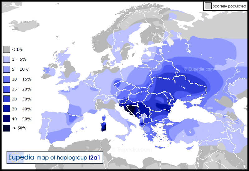 Распространение гаплогруппы I2a1 (ранее I2a) в Европе