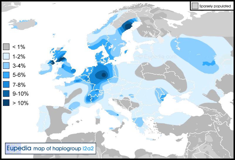 В настоящее время пик I2a2 наблюдается в центральной и северной Германии (10-20%), странах Бенилюкса (10-15%), а также в северной Швеции. Он также встречается у от 3 до 10% жителей Дании, восточной Англии и северной Франции. В Норвегии встречается реже, за исключением юга, где исторически датское влияние было самым сильным.