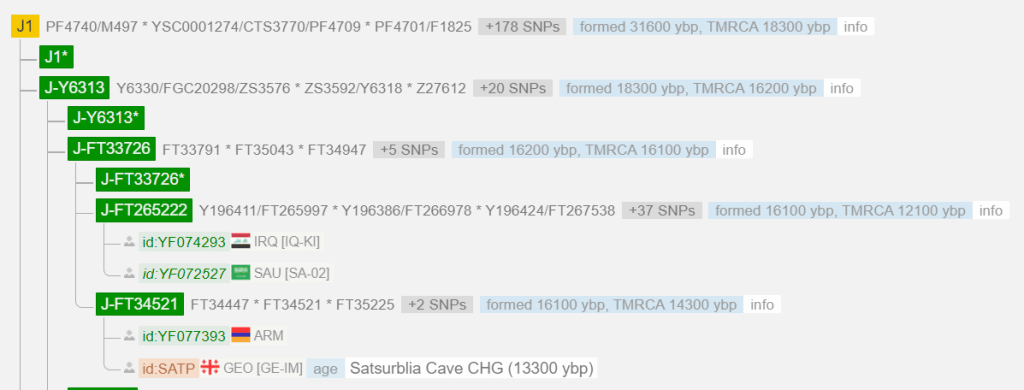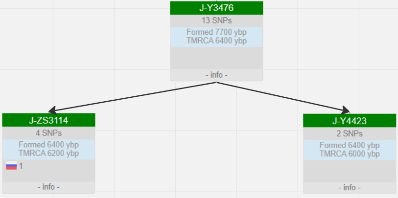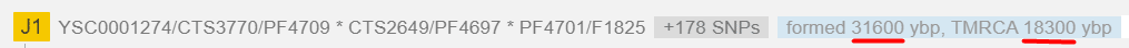 ~31 тыс. лет назад разошлись линии J1 и J2, в то время жил последний общий предок обоих гаплогрупп. Дальше провал на 12 тыс. лет. (formed 31600 — TMRCA 18300).