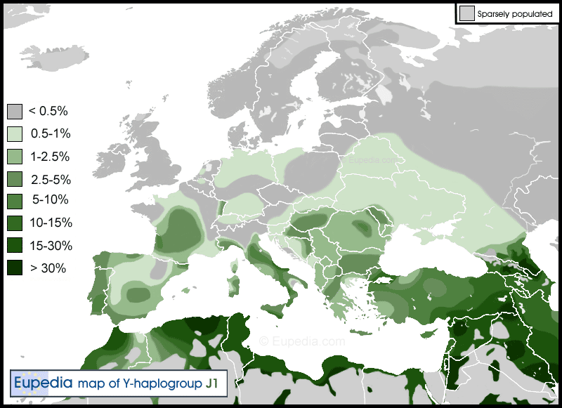 Большинство европейцев J1 принадлежат к ветви J1-Z1828, которая также встречается в Анатолии и на Кавказе, но не в арабских странах. Субклад Z1842 > Z1828 является наиболее распространенной разновидностью J1 в Армении и Грузии. Есть также две другие второстепенные европейские ветви: J1-Z2223, обнаруженная в Анатолии и Западной Европе, и J1-M365.1, также обнаруженная повсюду в Западной Европе. Вероятно они были одними из первых линий J1, покинувших Ближний Восток, возможно, в качестве позднепалеолитических или мезолитических охотников-собирателей, кочевавших за пределами Анатолии и вытесняемых последовательными волнами миграции от неолита к бронзовому веку, оказались в Западной Европе.