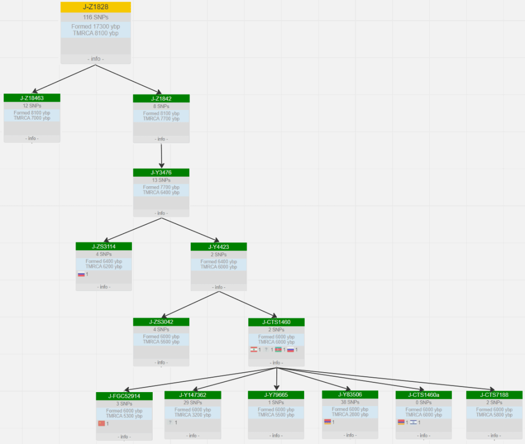 J1a2a (Z1828) Это второй по распространенности субклад верхнего уровня после J1-P58. Он особенно часто встречается в горах Тавр и Загрос и во всем Кавказском регионе, но также был обнаружен с низкими частотами в западной Турции, Греции, Украине, Южной Италии, Центральной Европе, Франции и на Британских островах. Субклад L1189, по-видимому, в основном североевропейский (+ несколько образцов в Греции и на Аравийском полуострове). Под Z1842 субклад CTS1460 географически ограничен Кавказом, Загросом и Тавром, тогда как ZS3089 встречается в основном вокруг Армении и Азербайджана.