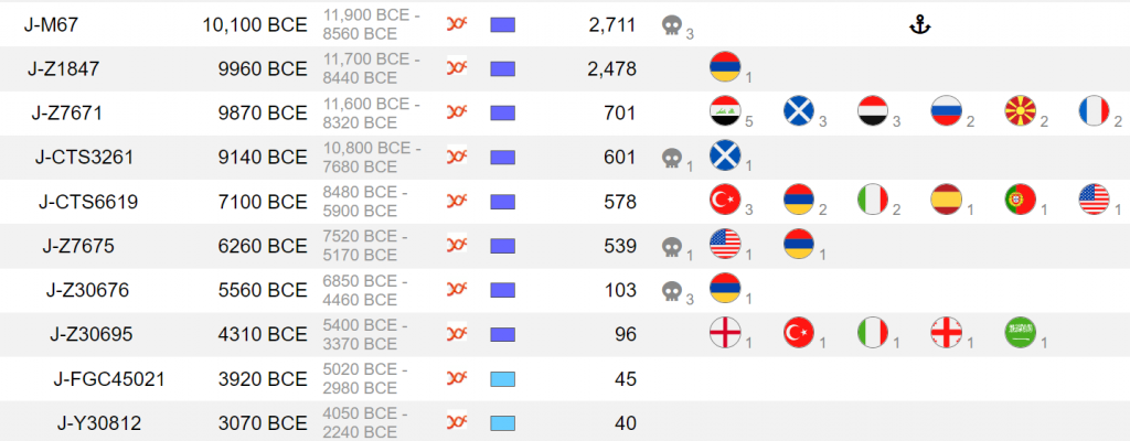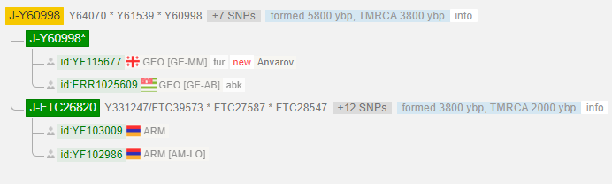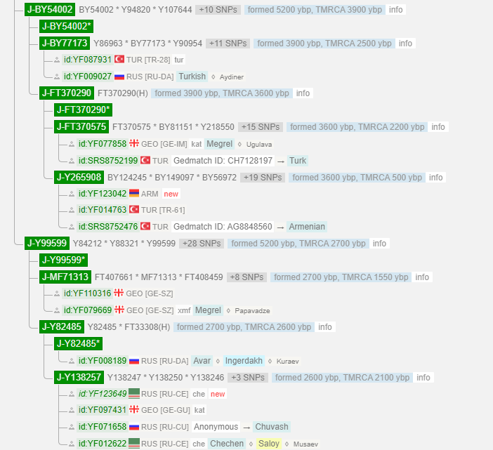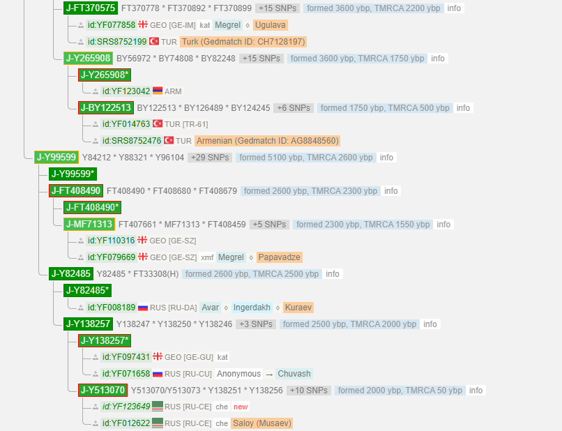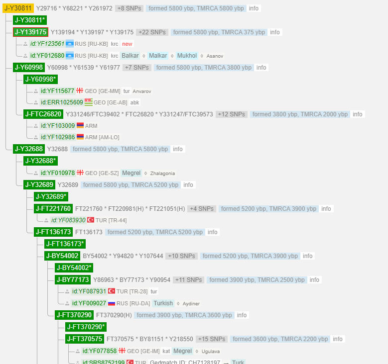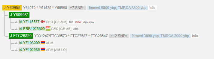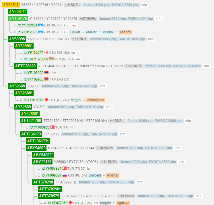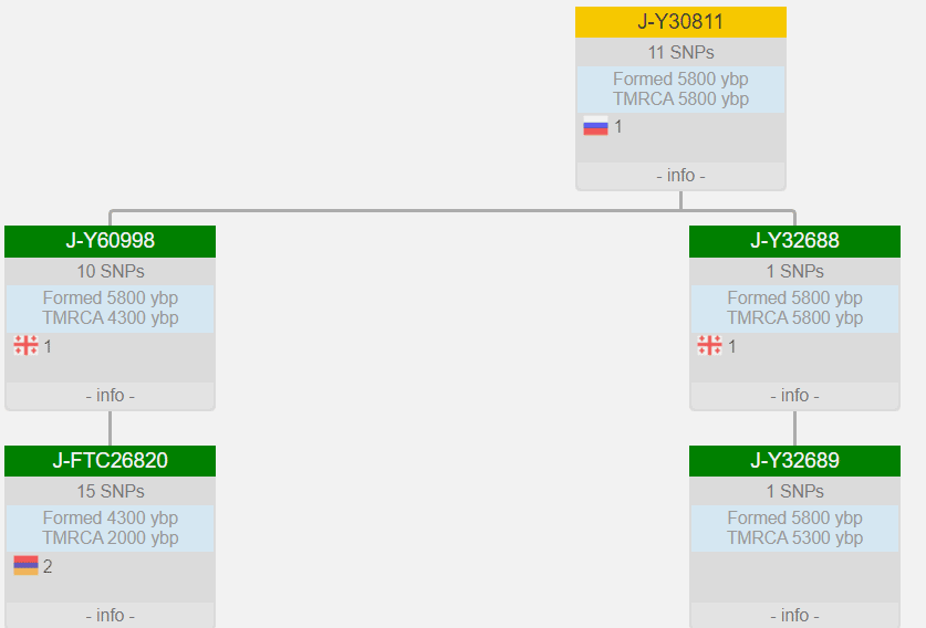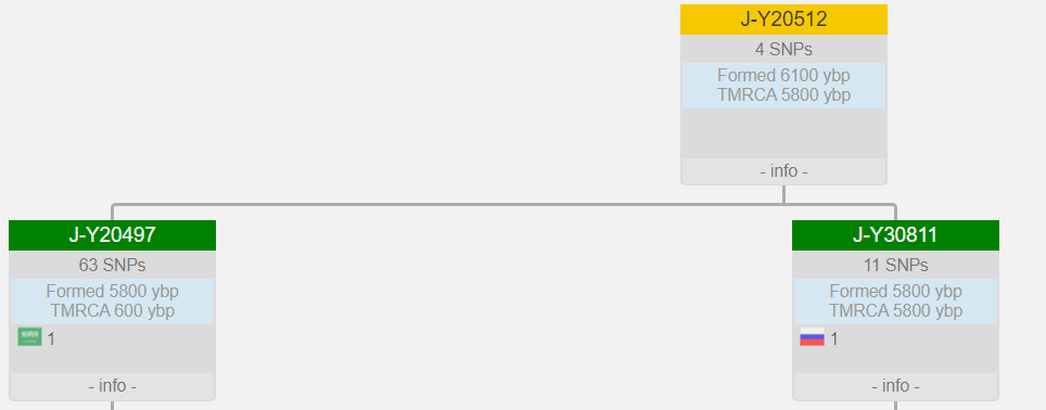 Возраст Y20512 ~ 5800 лет. Именно тогда она разделилась на 2 линии. Y20497 арабы, потомки одного человека жившего всего 600 лет назад. Вторую линию — Y30811 — можно назвать Кавказской. Вероятно примерно в эти сроки их общий прародитель и попал на Кавказ.