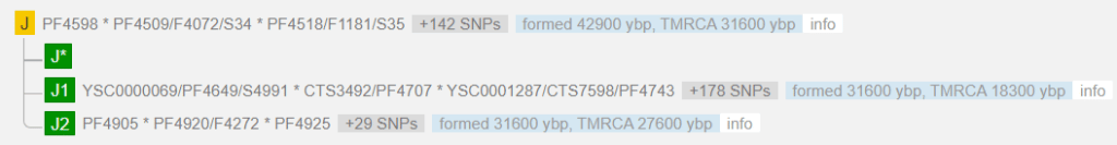 ~ 42,9 тыс. лет назад разошлись линии будущих I и J. Спустя более чем 10 тыс. лет J разделился на J1 (TMRCA 18,3 тыс. лет) и J2 (TMRCA 27,6 тыс. лет.