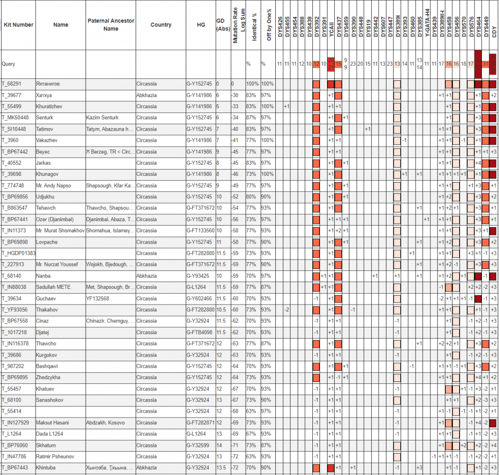 По результатам теста выявлена самая распространенная у адыгов линия G2a2 L1264. Субклад Y141911 чаще всего встречается у западных адыгов. Больше всего у шапсугов.