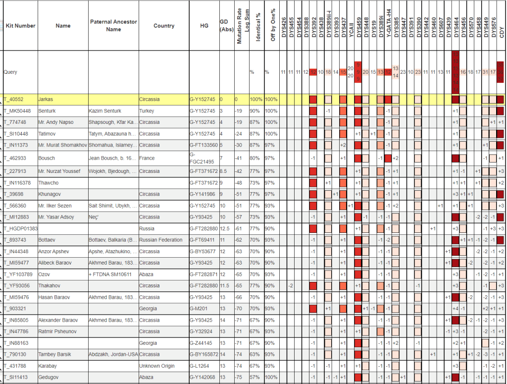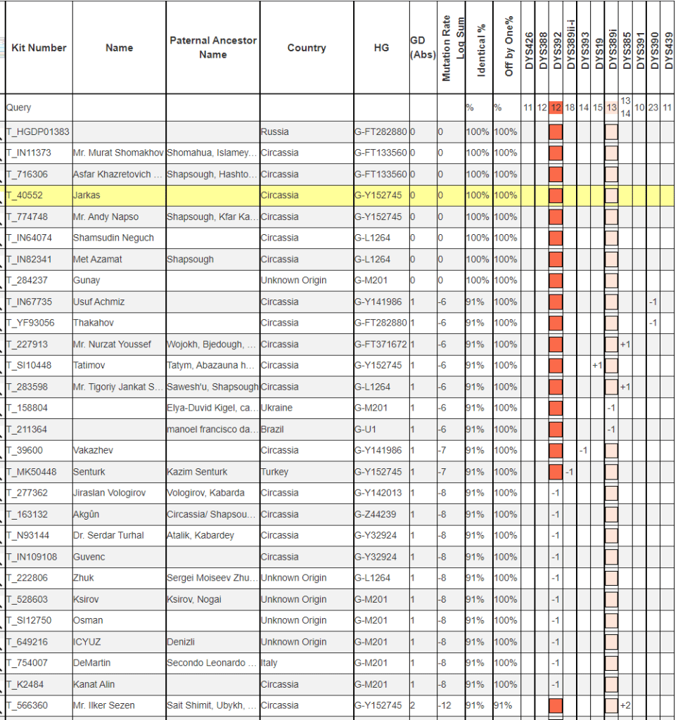 Один из важнейших смыслов исследования Y-хромосомы заключается в том, что наша многочисленная диаспора на чужбине может с нашей помощью найти свои корни. Яркий пример кабардинец (по другой версии убых) Jarkas. Настоящая фамилия была утеряна. В результате теста обнаружено близкое совпадение с кабардинцем Татимовым и убыхом Сезен-Шимит. И это не предположение, как обычно мы говорим при анализе маркерных тестов. В данном случае мы со 100% уверенностью может быть уверены, что они все втроем имеют относительно недавнее общее прошлое.