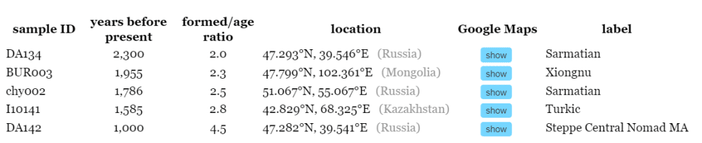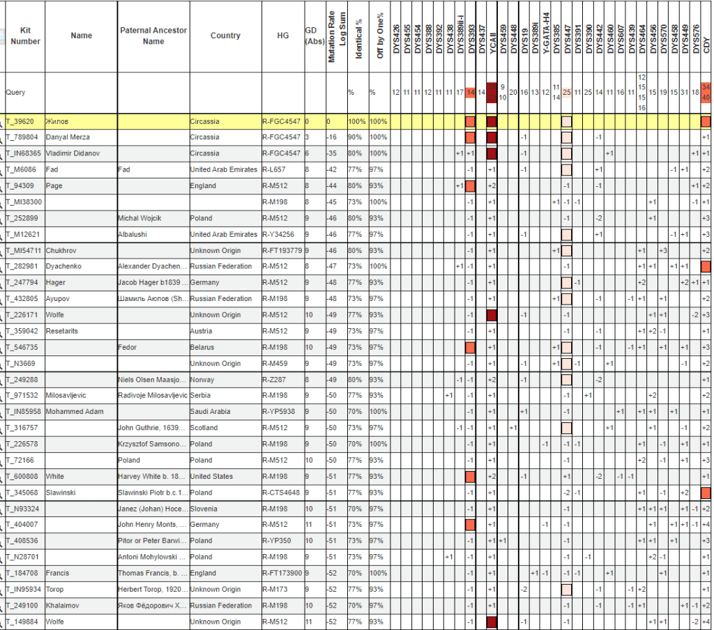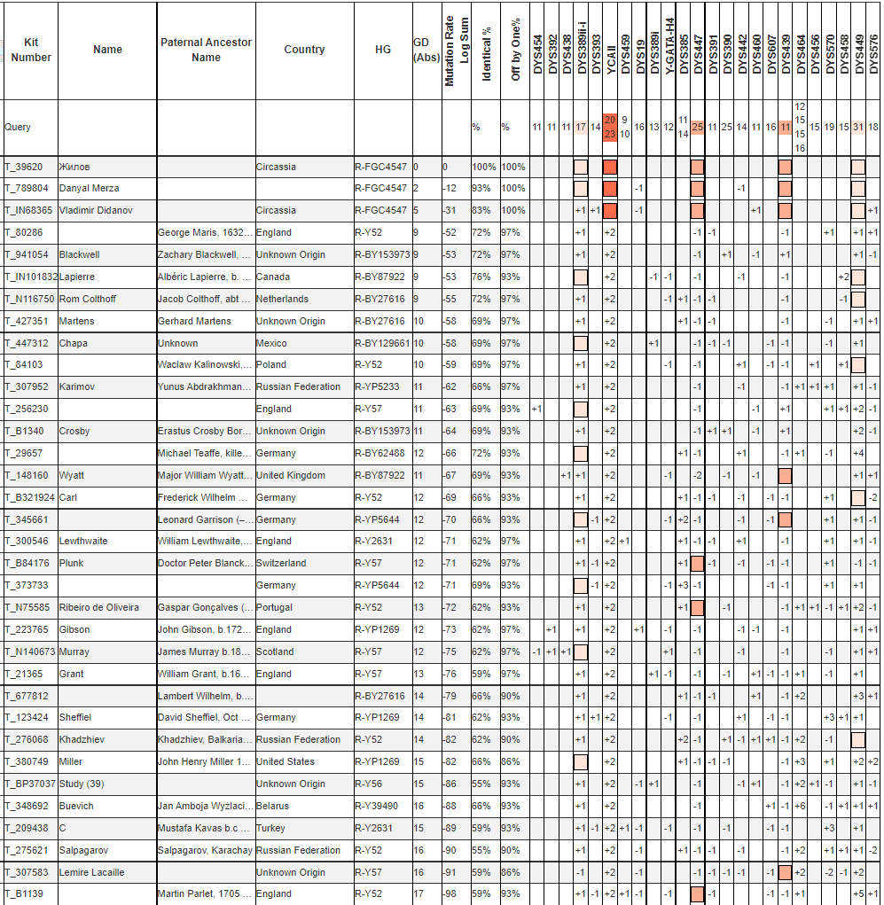 В списке совпадений есть даже представители R1b, что говорит о не репрезентативности такого сравнения. Для более показательного сравнения были отобраны результаты гарантированно попадающие в R-Y57.