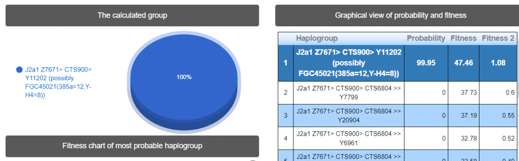 Выявлена гаплогруппа J2a. Наиболее вероятный субклад M67 >> Y11200 >> Y30811