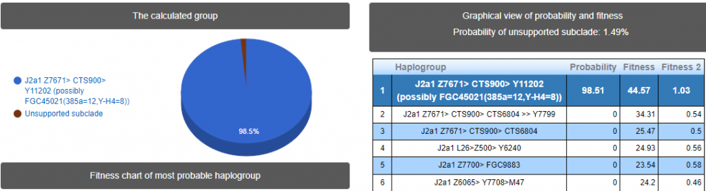Выявлена гаплогруппа J2a. Наиболее вероятный субклад M67 >> Y11200 >> Y30811.
