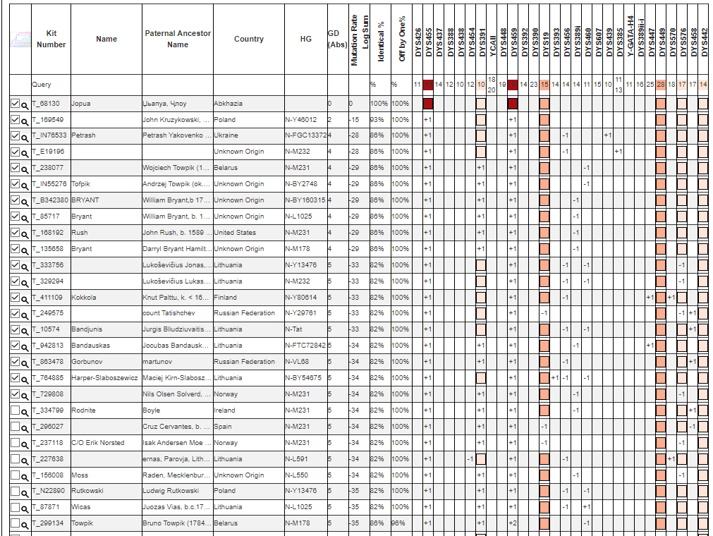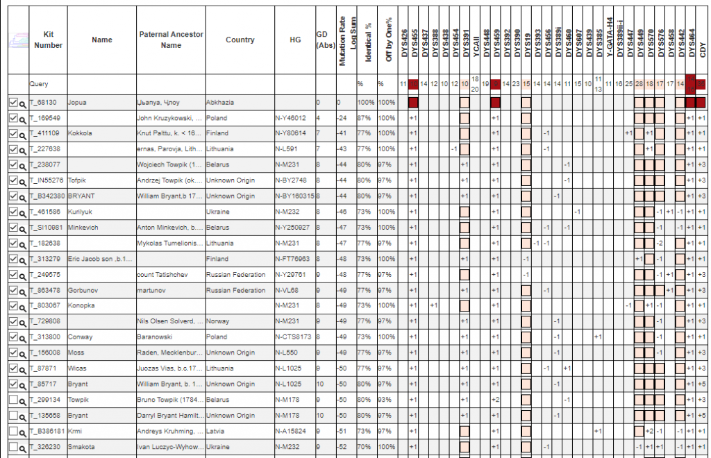 Поиск STR-совпадений в базе STR Match Finder помогает найти потенциальных родственников по мужской линии среди других протестированных из той же популяции. Мерой близости при этом служит генетическая дистанция, зависящая от числа мутационных различий